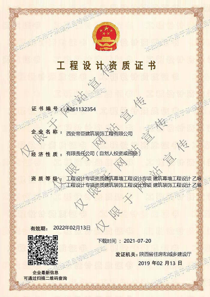 公司成立以來(lái)已成為建設(shè)部核準(zhǔn)的建筑裝修裝飾工程專(zhuān)業(yè)承包 一級(jí)、防水防腐保溫工程專(zhuān)業(yè)承包 二級(jí)、建筑機(jī)電安裝工程專(zhuān)業(yè)承包 三級(jí)、鋼結(jié)構(gòu)工程專(zhuān)業(yè)承包 三級(jí)、建筑幕墻工程專(zhuān)業(yè)承包 二級(jí)、消防設(shè)施工程專(zhuān)業(yè)承包 二級(jí)、環(huán)保工程專(zhuān)業(yè)承包 三級(jí)、建筑工程施工總承包 三級(jí)、機(jī)電工程施工總承包 三級(jí)、工程設(shè)計(jì)專(zhuān)項(xiàng)資質(zhì)建筑幕墻工程設(shè)計(jì)專(zhuān)項(xiàng) 建筑幕墻工程設(shè)計(jì) 乙級(jí)、工程設(shè)計(jì)專(zhuān)項(xiàng)資質(zhì)建筑裝飾工程設(shè)計(jì)專(zhuān)項(xiàng) 建筑裝飾工程設(shè)計(jì) 乙級(jí)的裝飾企業(yè)……